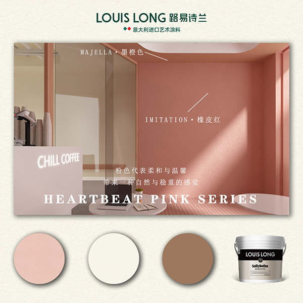 墙面采用Imitation·伊米塔·3D石-米驼色/橡皮红拼接,加上粉色方砖丝滑的线型造型,