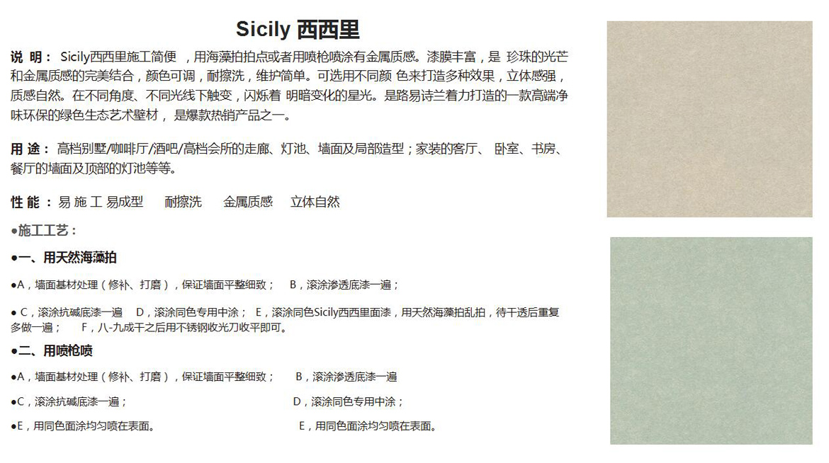 :Sicily西西里施工简便 ,用海藻拍拍点或者用喷枪喷涂有金属质感。漆膜丰富,是 珍珠的光芒和金属质感的完美结合,颜色可调,耐擦洗,维护简单。可选用不同颜 色来打造多种效果,立体感强,质感自然。在不同角度、不同光线下触变,闪烁着 明暗变化的星光。是路易诗兰着力打造的一款高端净味环保的绿色生态艺术壁材, 是爆款热销产品之一。
